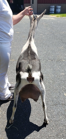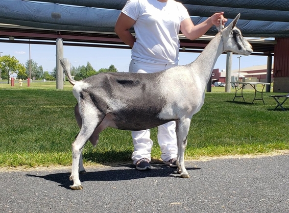 Toast is one of the farm favorites for her silly personable antics. She is the goat that is in your pocket while you are trying to work, and while she is there....she needs to know if you have cookies! Toast shows the gorgeous swan-like neck and smooth front end that was gifted to her from her granddam Diva. She has proven herself to be quite productive in the milk room, peaking this year at 14.7 #. She has terrific shape and attachment of mammary, her biggest fault is that she does have bigger teats that are not as aesthetically pleasing. That said, she milks out easily and completely, so I can let that slide a bit :)